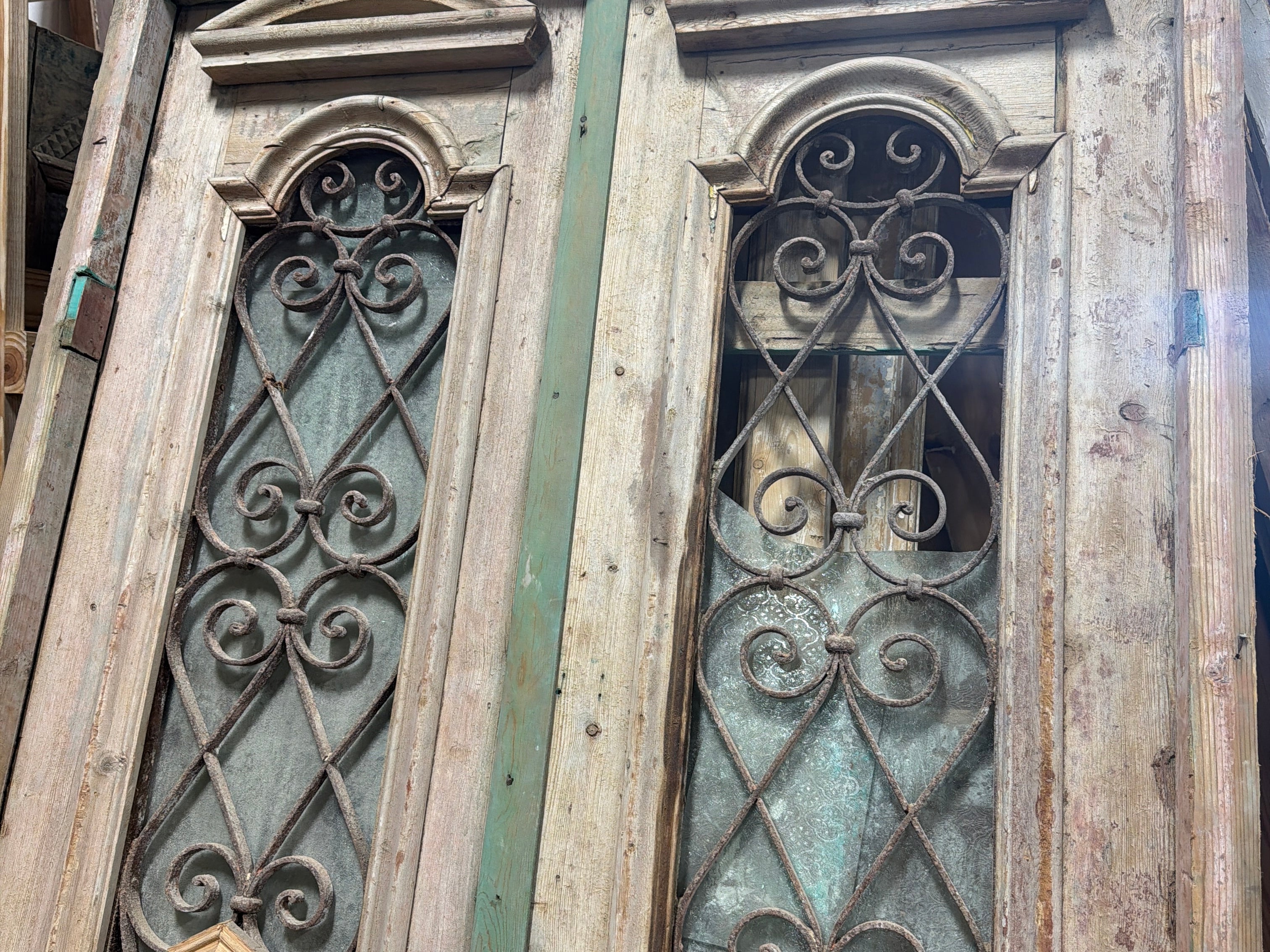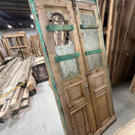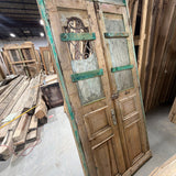#1290 Doors with Iron in Average condition. Dimensions: 45in wide 99in tall 1.75in deep. Sold as a Pair.