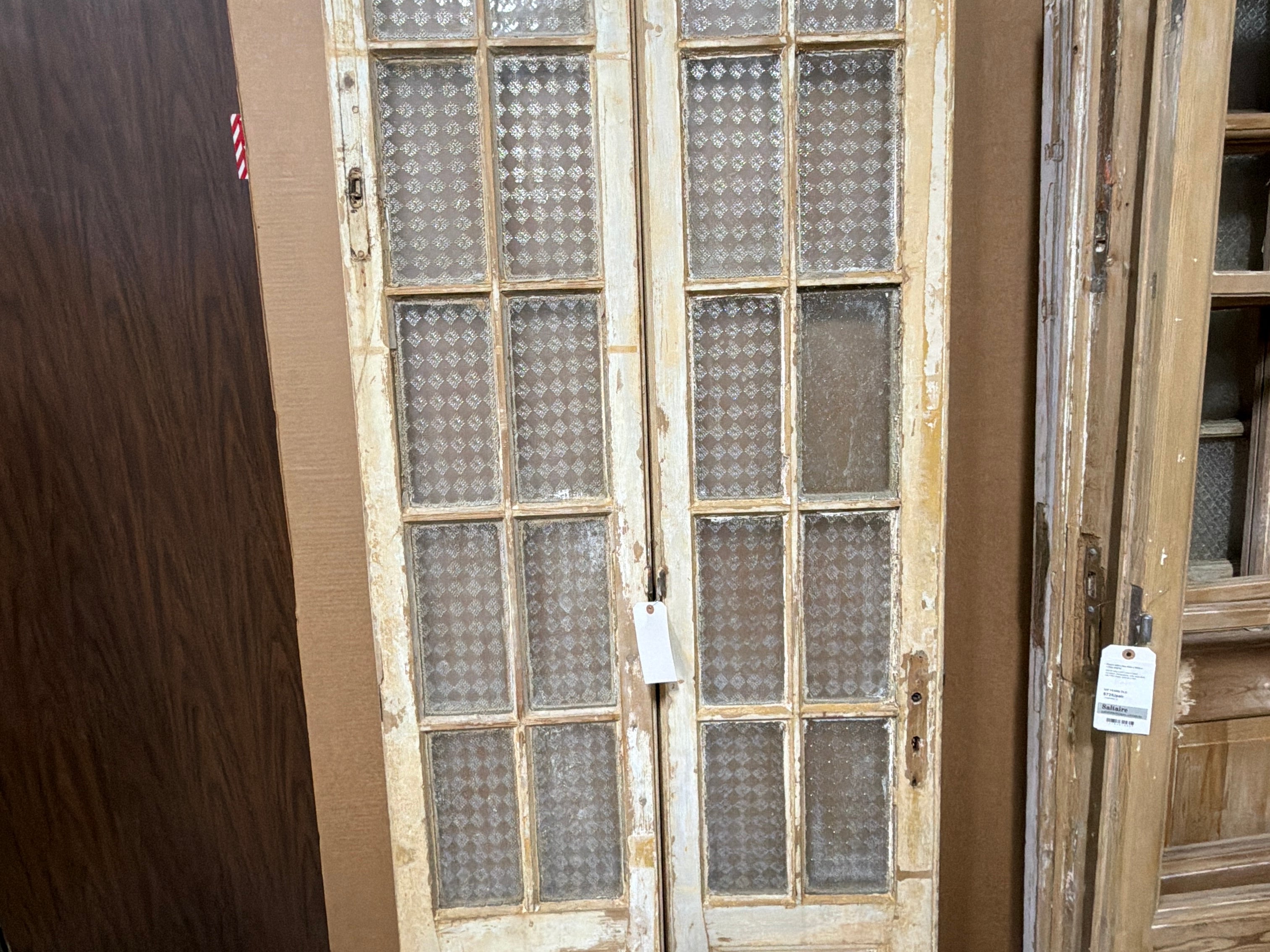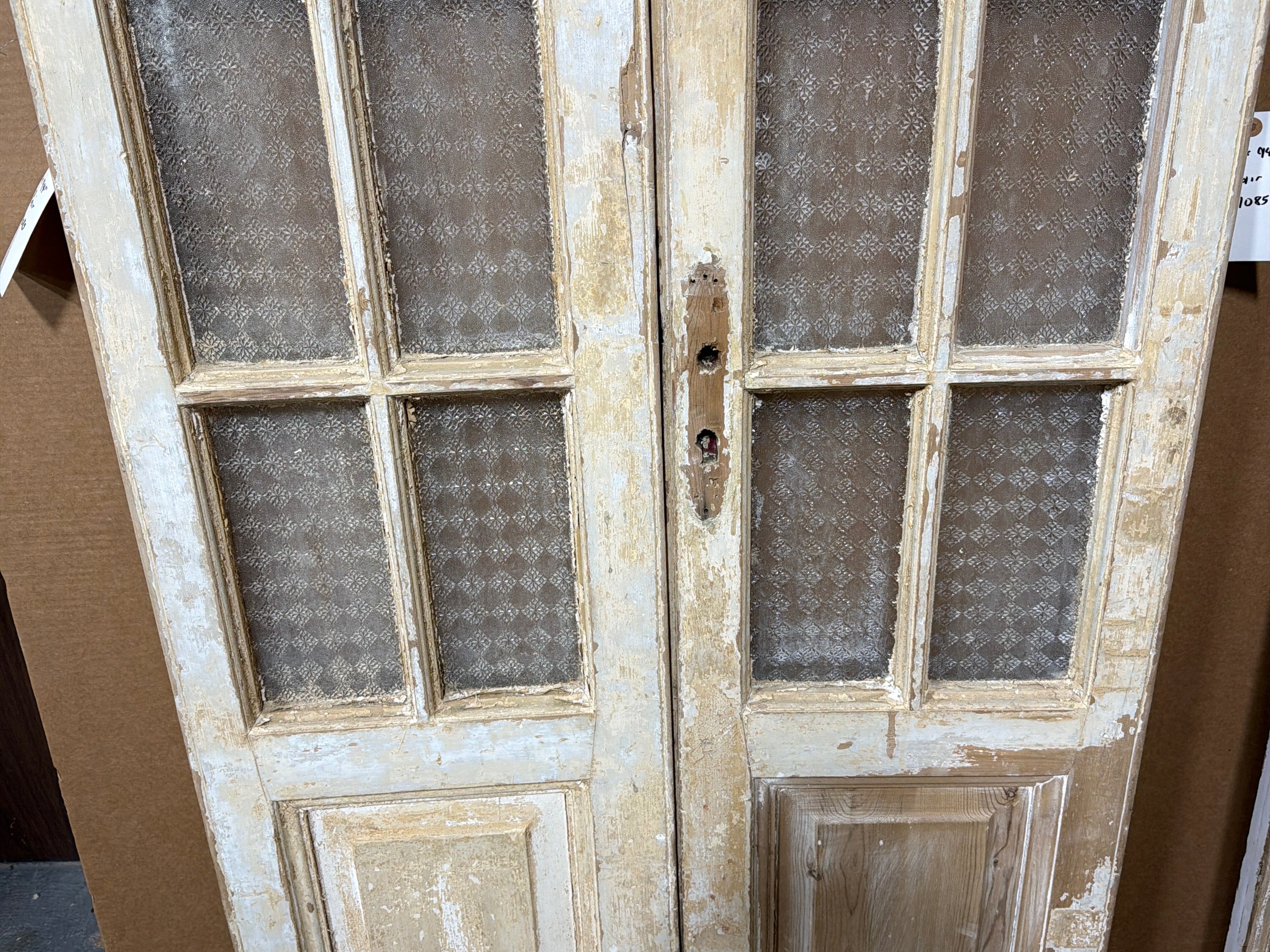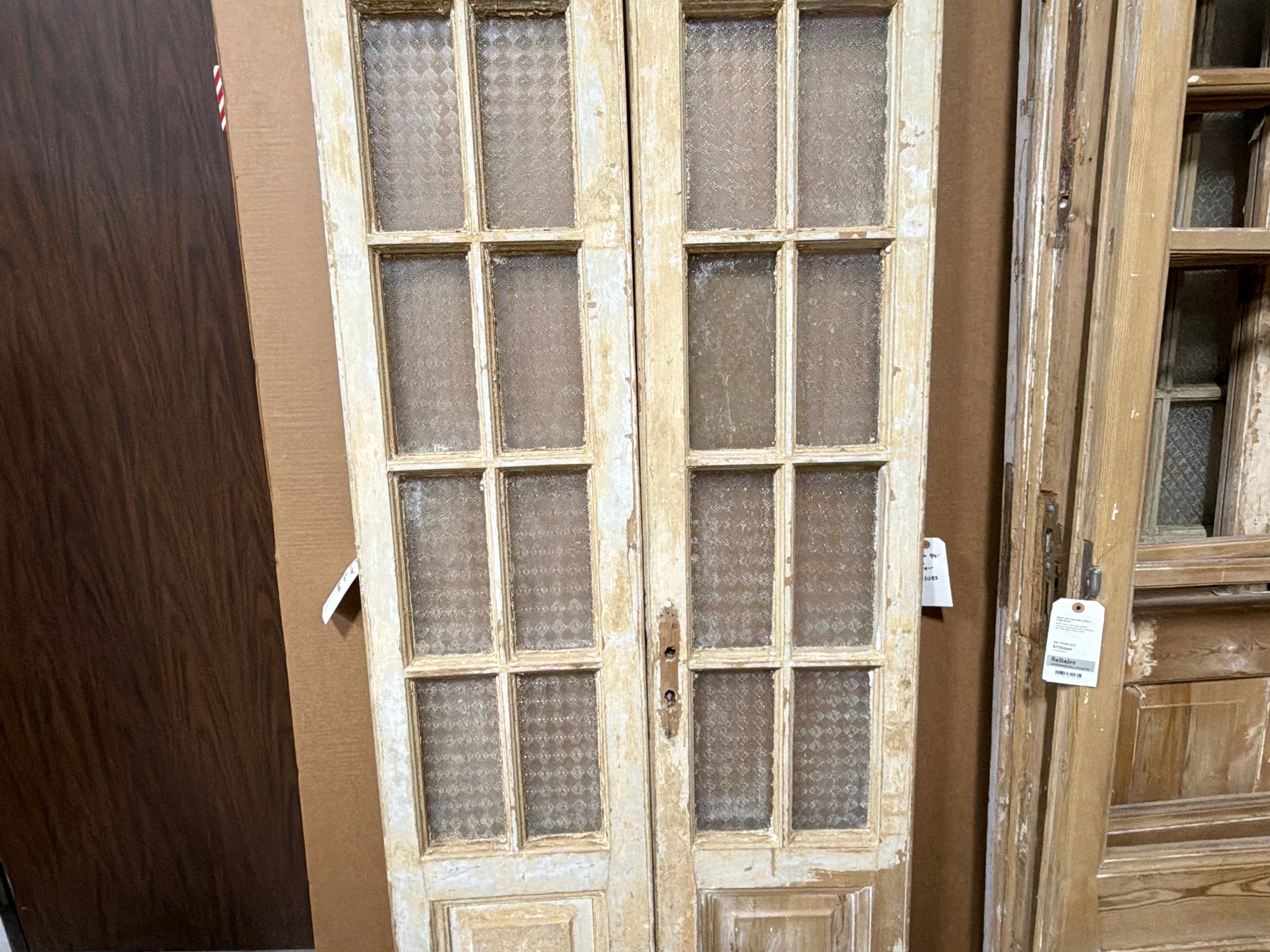 #1280 Doors with Lites in Average condition. Dimensions: 35in wide 94in tall 1.75in deep. Sold as a Pair.