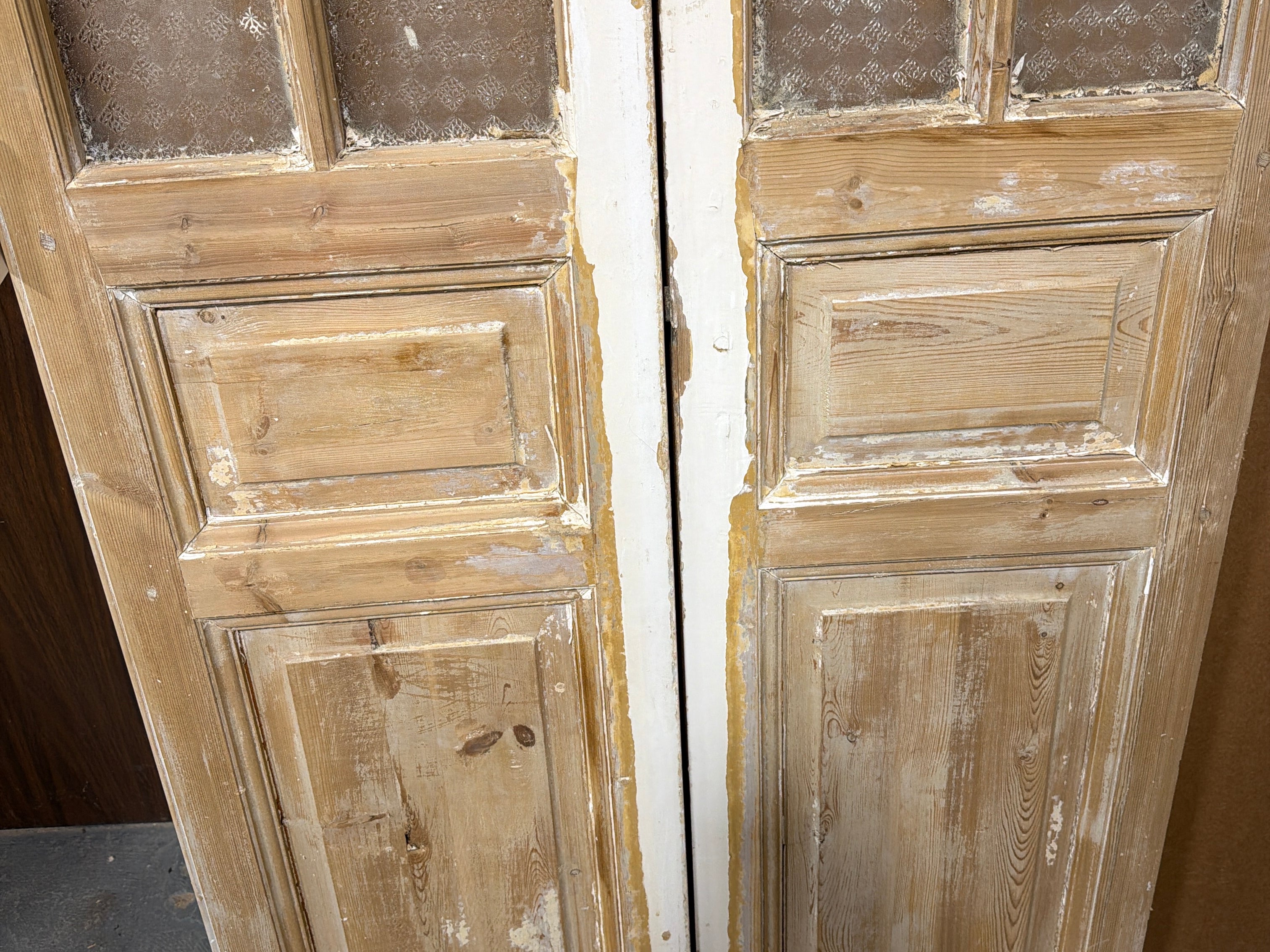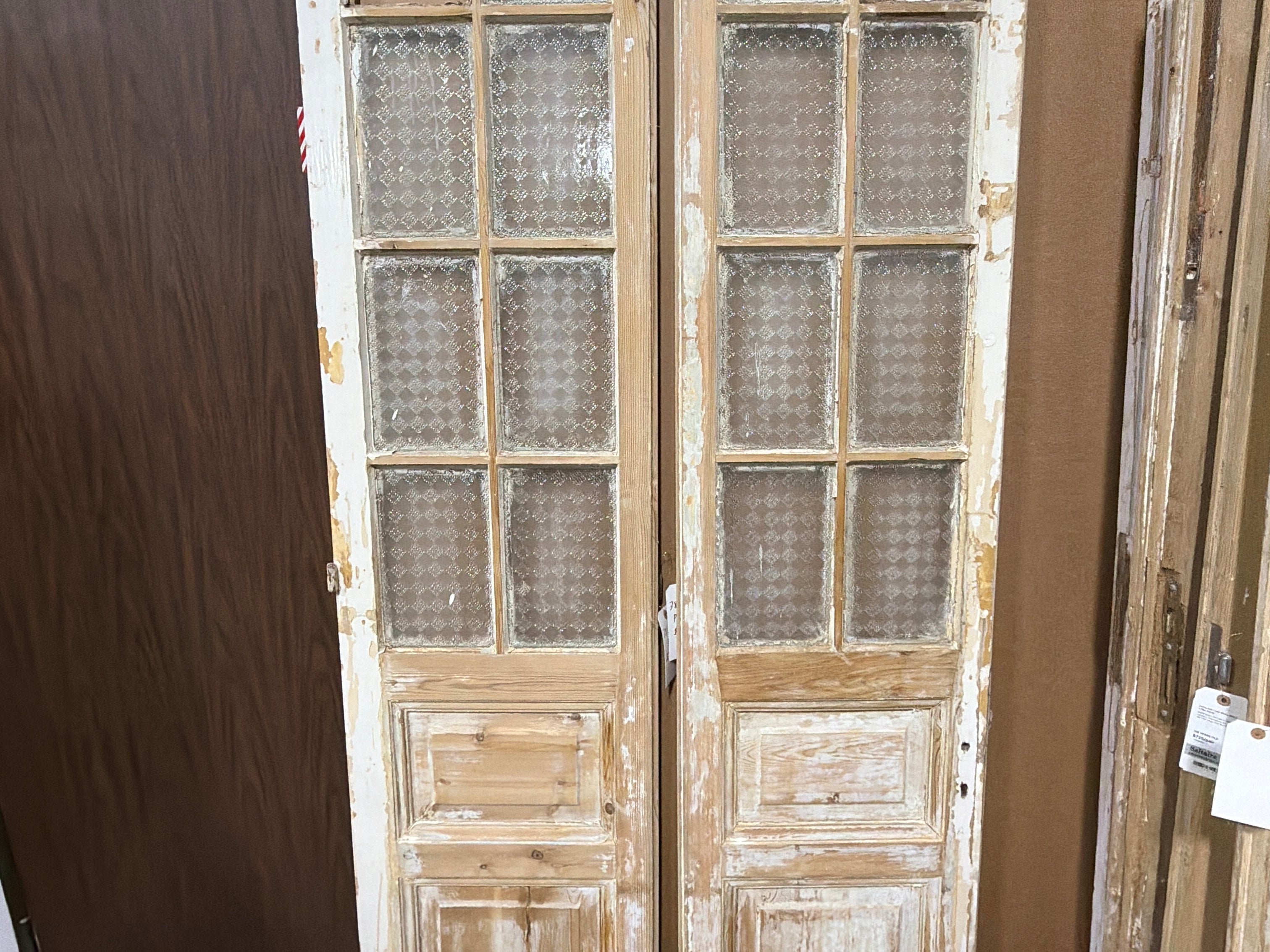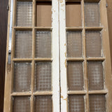 #1281 Doors with Lites in Average condition. Dimensions: 38in wide 95in tall 1.75in deep. Sold as a Pair.